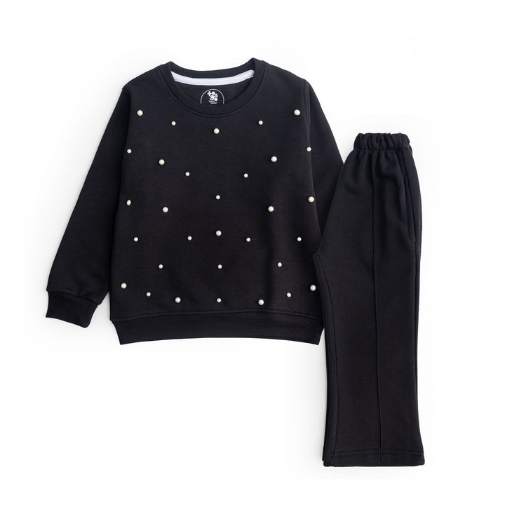 This stylish Black Pearl Track Suit for girls is perfect for both comfort and fashion. Crafted from soft fleece fabric, it offers warmth and a cozy fit, ideal for chilly days or casual outings. The sweatshirt features a beautiful pearl embellishment, adding a touch of elegance to the sporty look. Paired with flared black trousers, this track suit is both trendy and functional, making it a must-have addition to any wardrobe.