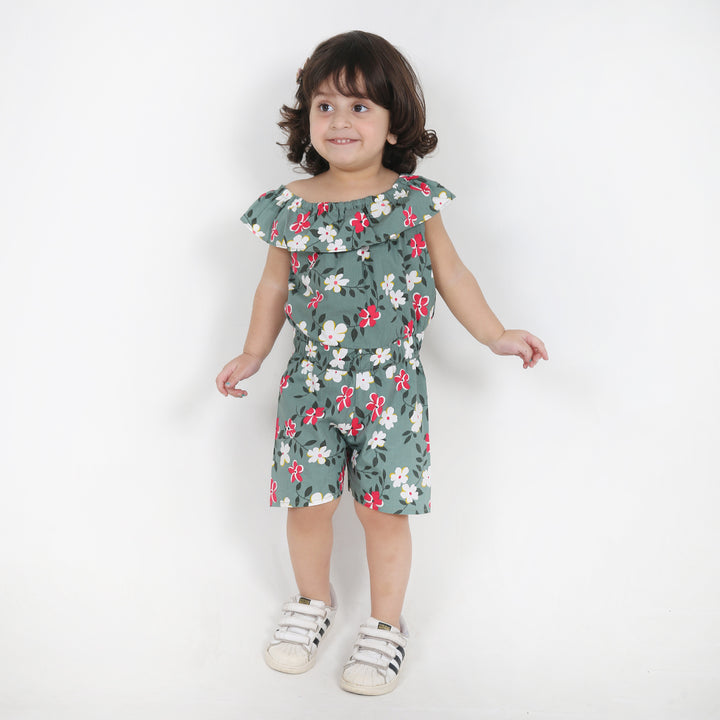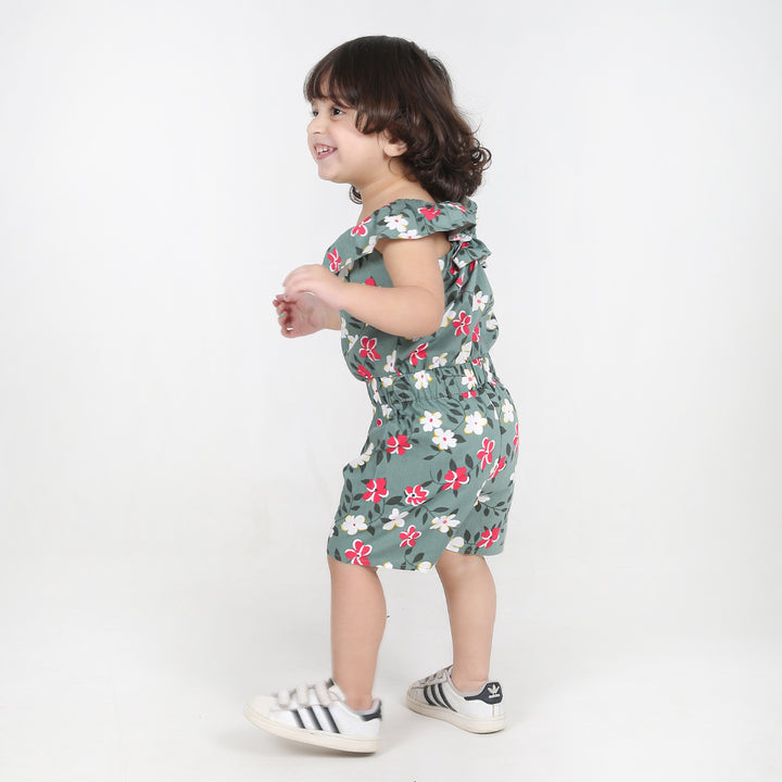 The green floral romper is a fresh and feminine outfit choice, perfect for summer. Its green color and floral pattern exude charm and playfulness. Easy to wear and style, it's ideal for casual occasions and can be dressed up or down with different accessories.