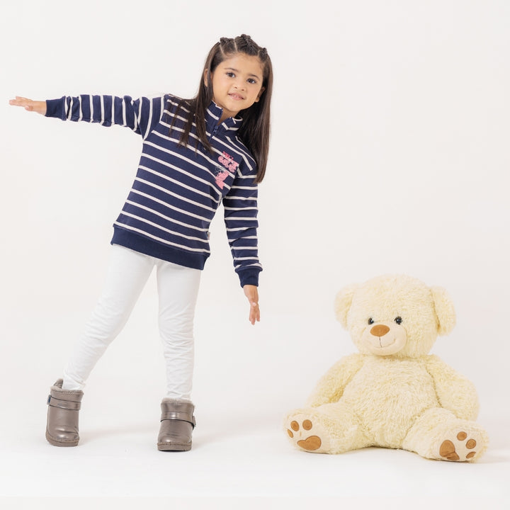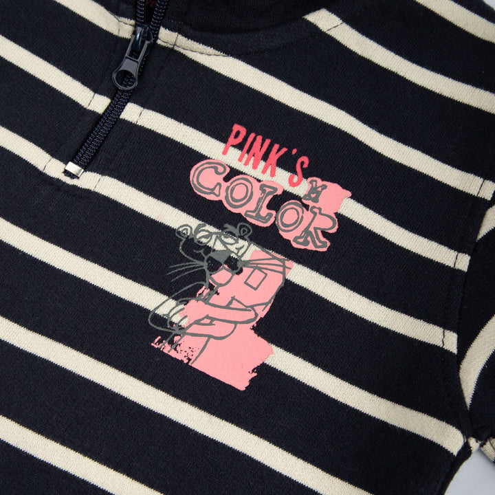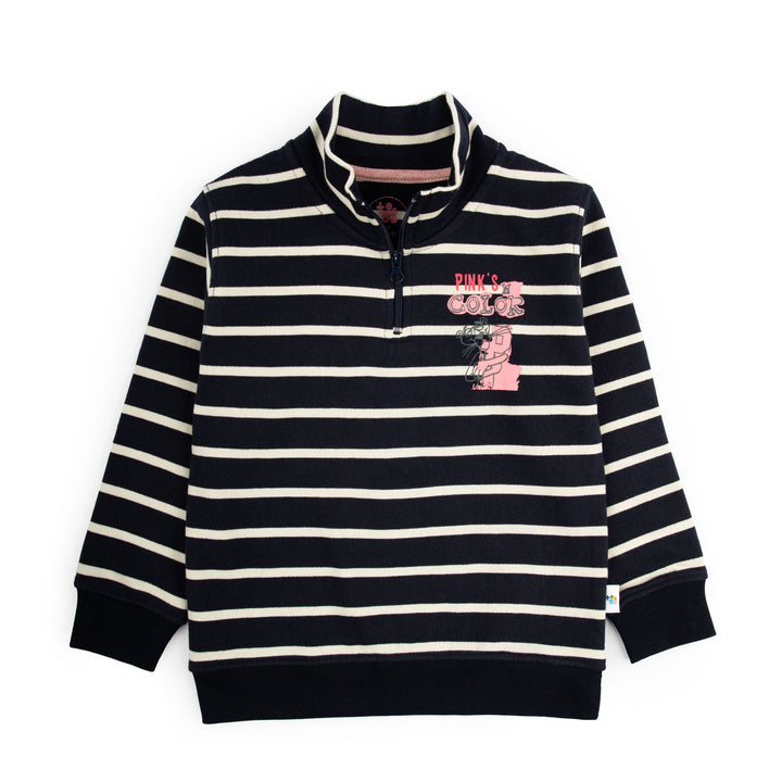 Keep your little ones stylish and cozy with our Navy White Mock Neck Striper Shirt for Kids! This fleece shirt features a charming Pink Panther graphic on the front, adding a playful touch to their wardrobe.