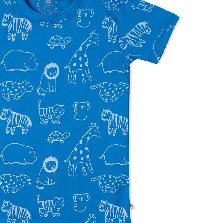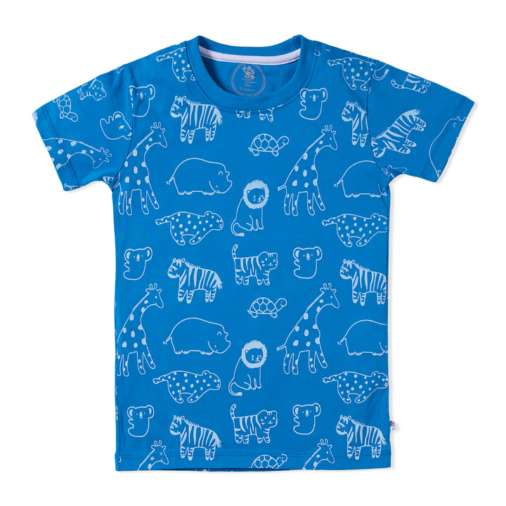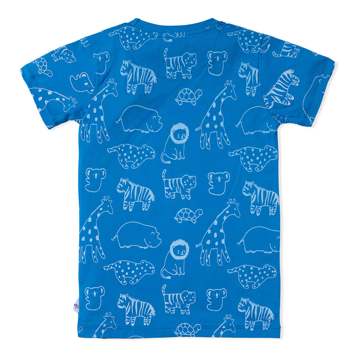 The Ocean Blue Animal T-Shirt in jersey fabric is a fun and vibrant addition to any kid's wardrobe. Made from soft and comfortable jersey material, it ensures all-day comfort for playtime adventures. The ocean blue color evokes the calming vibes of the sea, while the animal print adds a playful and adventurous touch. Whether he's exploring the outdoors or having a laid-back day at home, this T-shirt offers both style and comfort. Pair it with shorts or jeans for a casual and cool look that's perfect for any little explorer.