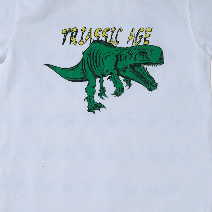 The "Triassic Age White T-Shirt" in jersey is a comfortable top suitable for various occasions, featuring a design inspired by dinosaurs or prehistoric themes.